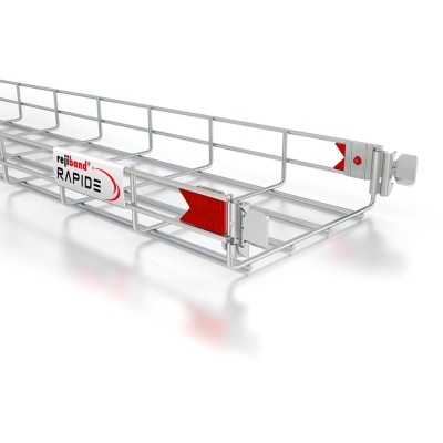 Bandeja de rejilla fabricada en acero con sistema Click de unión rápida y borde de seguridad redondeado para soporte y conducción de cables. La Bandeja portacables Rejiband® Rapide está compuesta de varillas electrosoldadas en malla que proporcionan una gran resistencia y elasticidad. La facilidad en el montaje, gracias a su flexibilidad y a su sistema click de unión rápida, permite la unión entre tramos de bandejas sin necesidad de tornillos, lo que supone un ahorro en material y en coste de mano de obra. Fabricada según normativa internacional IEC 61537. Se distribuye en diversos tamaños y en varios Sistemas de protección.