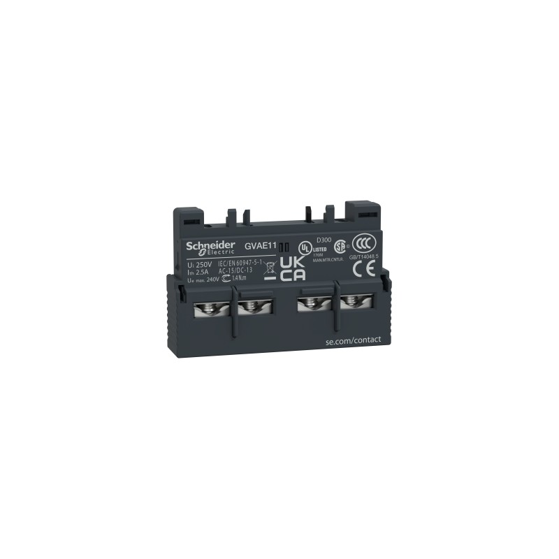 Bloque de contactos auxiliares TeSys GV para interruptores automáticos de motor GV2 y GV3. Contactos auxiliares instantáneos 1 NA + 1 NC Especificado para funcionar hasta a 2 A/240 V CA y 1 A/60 V CC. Para instalar en la parte frontal del interruptor automático, conexión mediante bornes de tornillo. Se vende en lotes de 10 unidades. Certificado por diversas normas (IEC, UL, CSA, CCC, EAC), cumple la norma Green Premium (RoHS/REACh).